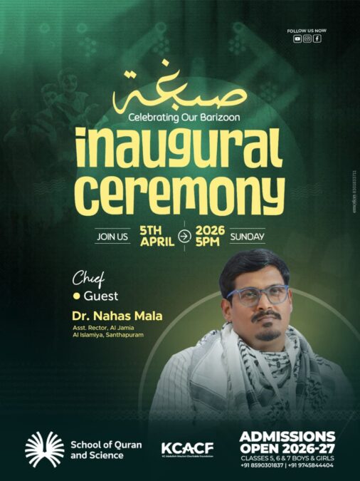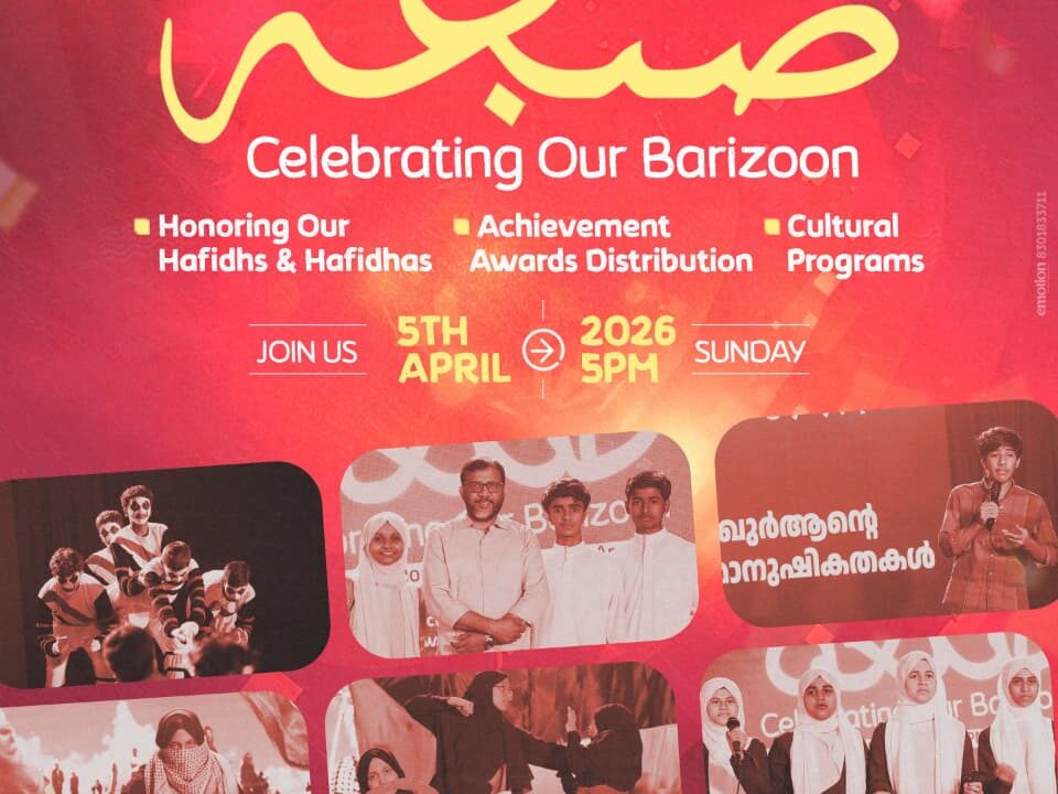 Swibga ’26 Celebrating Our Barizoon ✨ 🌙 Inaugural Ceremony Join us on April 5 | 5 PM ✨ 🎤 Chief Guest: Dr Nahas Mala (Asst. Rector, Al Jamia Al Islamiya) 🗓️ 5th April 2026 (Sunday) 🕔 5:00 PM Join us and be part of this proud and joyful occasion. Related postsSwibga ’26 – Celebrating Our BarizoonRead moreK.C. Abdullah Moulavi PuraskaramRead moreK.C. Abdullah Moulavi PuraskaramRead more